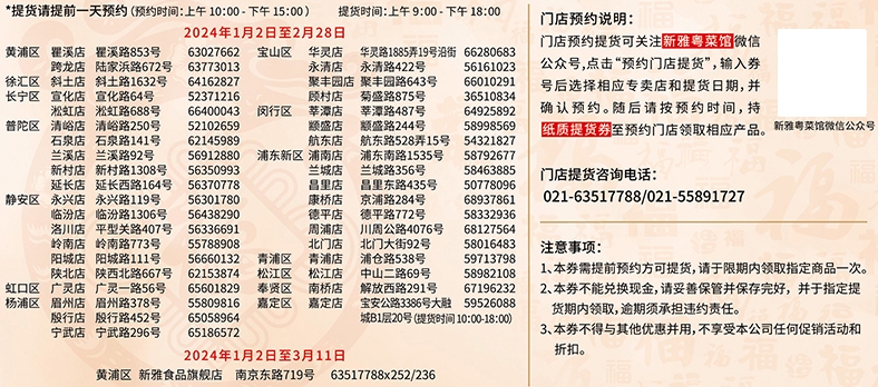 提貨日期:各門店提貨日期2024年1月2日----2024年2月28日,